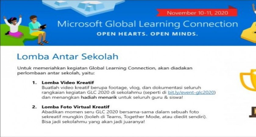 Microsoft Global Learning Connection merupakan acara yang digelar untuk merayakan pembelajaran tanpa batas selama 48 jam nonstop. Ribuan pelajar, pendidik, dan pembicara ahli bergabung dalam sebuah perjalanan virtual bersama dalam sambungan Teams, bertemu dengan teman baru, membuka hati dan pikiran terhadap dunia, dan melihat seberapa banyak perjalanan virtual mengelilingi dunia dapat ditempuh dalam 48 jam.