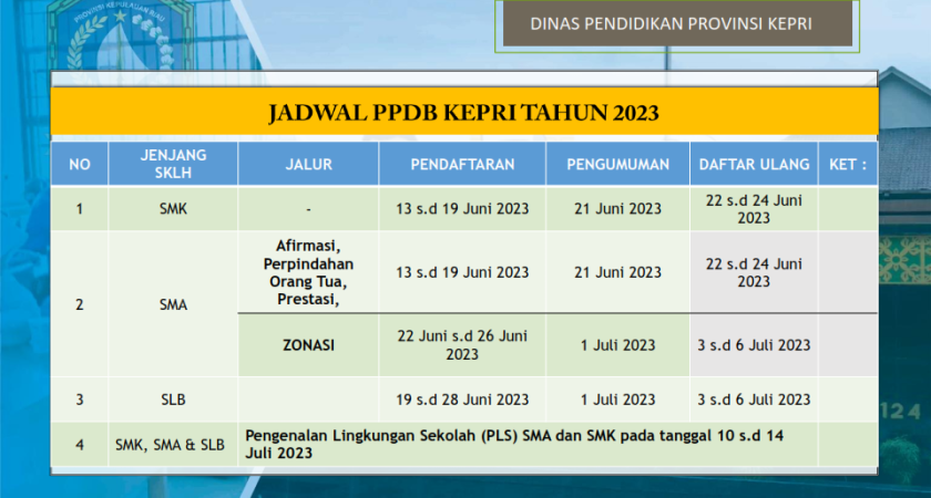 - Keputusan Kepala Dinas Pendidikan Provinsi Kepulauan Riau Nomor 1268/KPTS-4/V/2023 Tentang Petunjuk Teknis Penerimaan Peserta Didik Baru Tahun Pelajaran 2023/2024 Sekolah Menengah Atas (SMA), Sekolah Menengah Kejuruan (SMK), dan Sekolah Luar Biasa (SLB).
