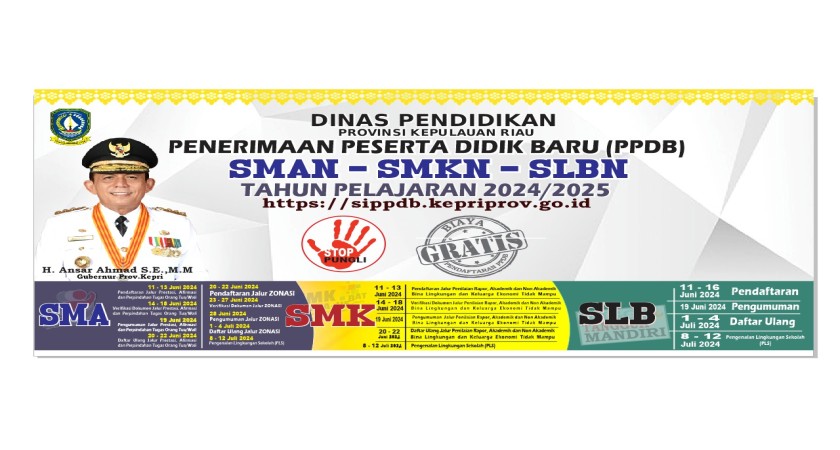 PPDB Online 2024 adalah bentuk tindaklanjut dari Permendikbud Nomor 1 Tahun 2021 tentang pelaksanaan PPDB serta Petunjuk Teknis Dinas Pendidikan Provinsi Kepulauan Riau tentang Penerimaan Peserta Didik Baru Tahun 2024, dengan mengacu kepada protokol Kesehatan dan antisipasi penyebaran Covid 19. Sistem pendaftaran jenjang SMA dan SMK adalah secara online oleh karena itu dimohon untuk peserta memahami Syarat dan Tata cara pendaftaran yang dijelaskan di Portal PPDB Online Provinsi Kepulauan Riau.